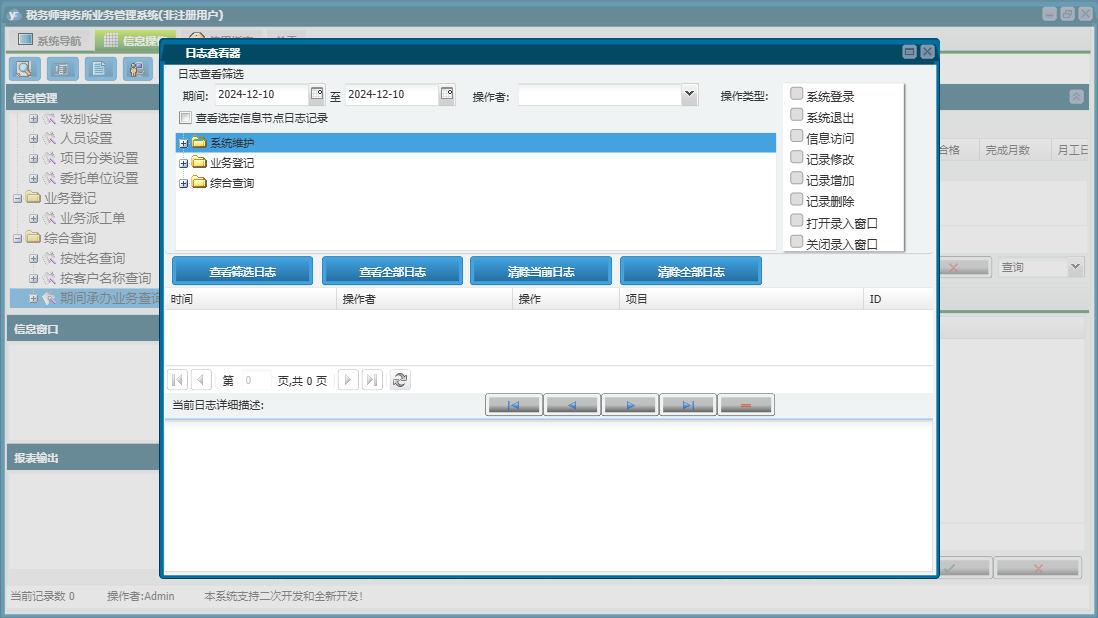 税务师事务所业务管理系统包含以下功能:部门设置、导航、级别设置、日志、委托单位设置、人员设置、关于、项目分类设置、权限设置、业务派工单等