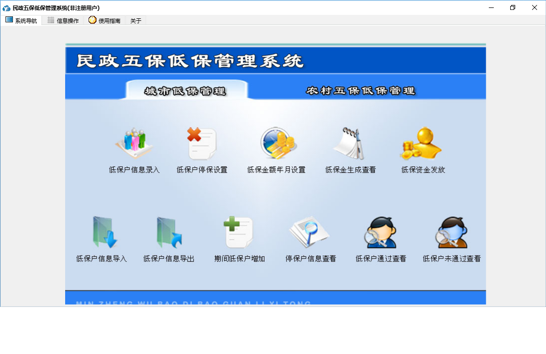 民政五保低保管理系统包含以下功能:低保户信息录入、保障金额设置、低保户停保设置、低保金生成查看、日志、五保户信息录入、五保停保设置、关于、农村、权限设置、低保金额年月设置、设置年月发放、城市等