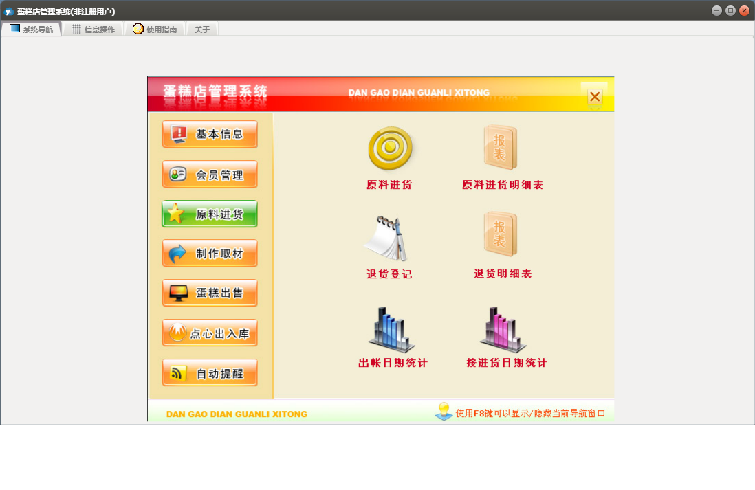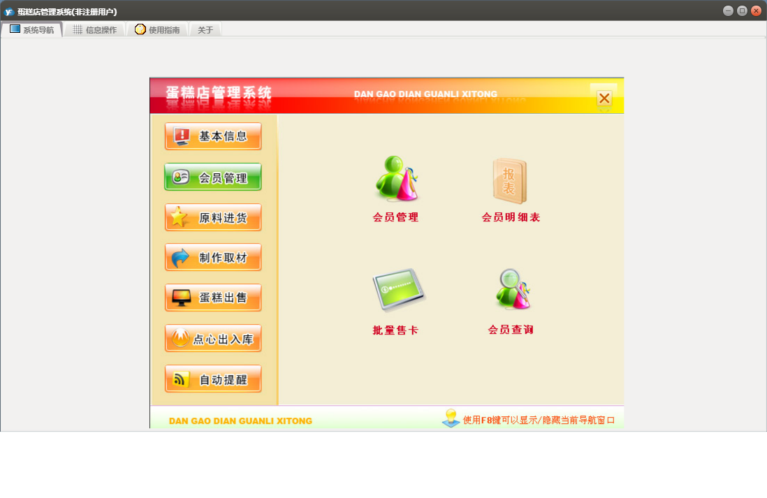 蛋糕店管理系统包含以下功能:蛋糕类型、点心入库、批量售卡、点心出库、蛋糕出售、权限设置、蛋糕预定、退货、点心出入库、员工信息录入、制作取材、关于、基本信息、客户信息、会员管理、供商信息、日志、提醒、原料进货等