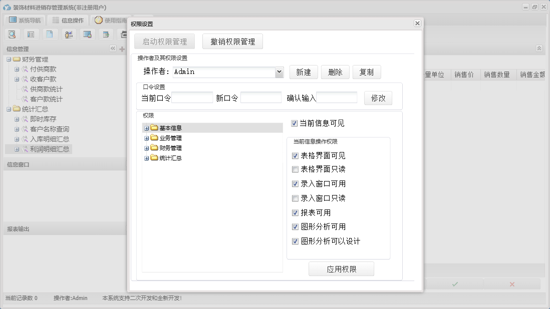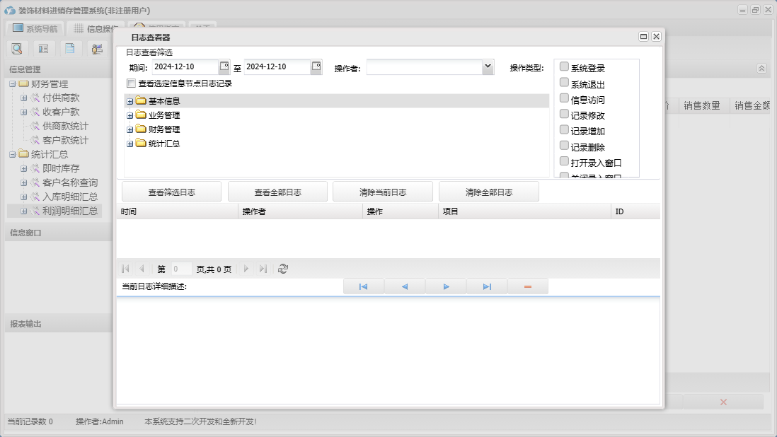 装饰材料进销存管理系统包含以下功能:日志、关于、基本信息、权限设置、统计汇总、财务管理、业务管理等