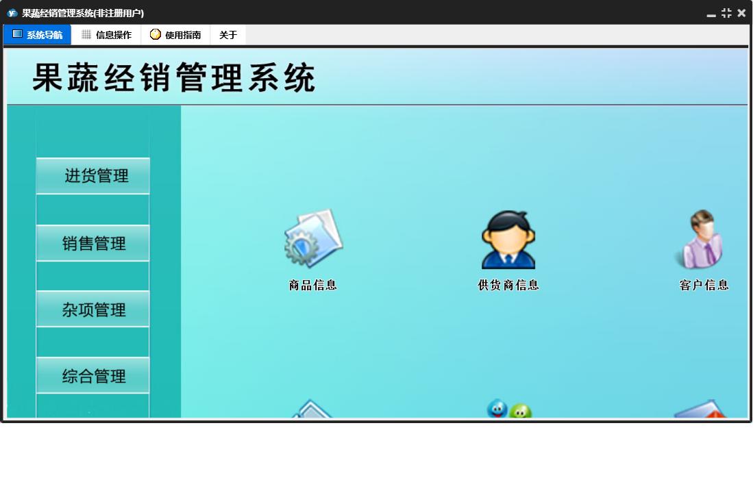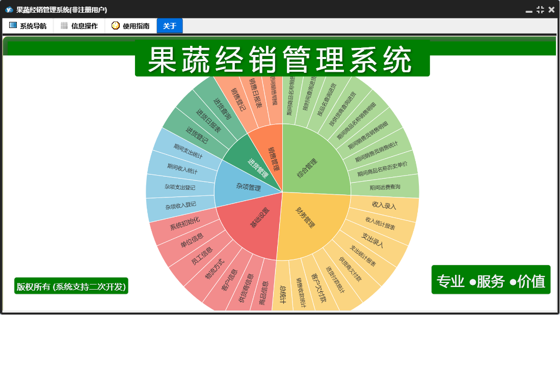 果蔬经销管理系统包含以下功能:销售管理、供货商欠付款、客户欠付款、物流方式、财务管理、商品信息、杂项收入登记、权限设置、杂项支出登记、进货登记、收入录入、关于、销售登记、基本信息、客户信息、进货管理、综合管理、支出录入、员工信息、供货商信息、日志、杂项管理等