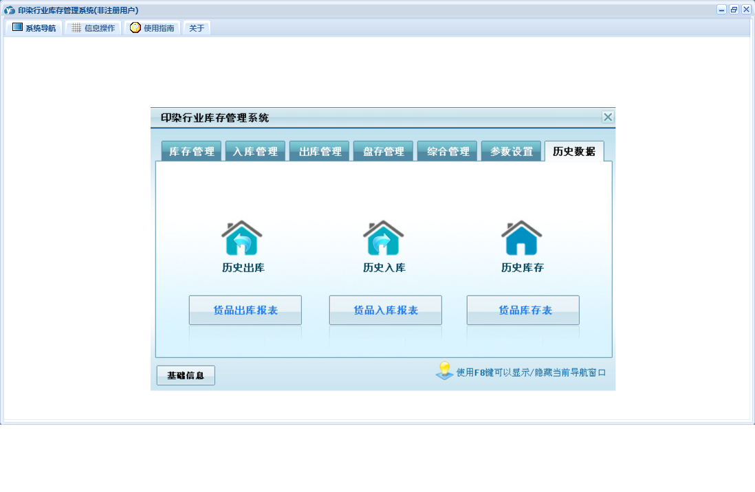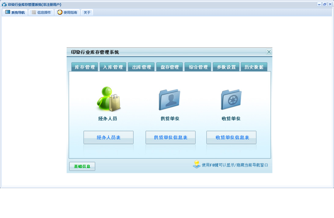 印染行业库存管理系统包含以下功能:货品信息、出库登记、入库登记、历史数据、收货单位、权限设置、仓库信息、出库管理、经办人员、库存管理、盘存管理、关于、入库管理、基础信息、供货单位、综合管理、日志、盘存录入、参数设置等