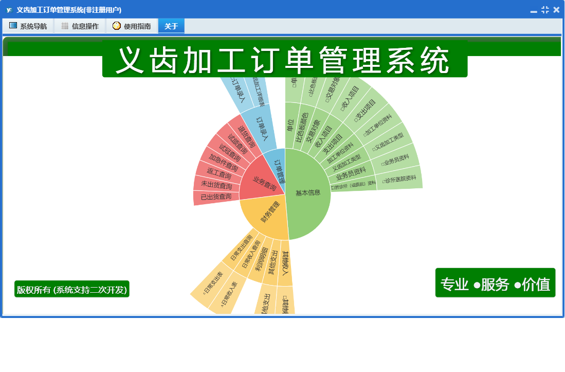 义齿加工订单管理系统包含以下功能:其他收入、财务管理、口腔诊所(或医院)资料、其他支出、收入项目、业务员资料、权限设置、交易对象、支出项目、订单管理、关于、基本信息、比色板颜色、订单录入、义齿加工类型、加工单位资料、日志、业务查询、单位等