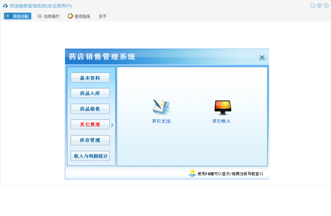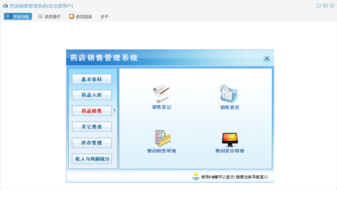 药店销售管理系统包含以下功能:药品销售、收入与利润统计、其它支出、药店信息、药品入库、销售退货、权限设置、进货单位、基本资料、药品信息、库存管理、关于、销售登记、其它收入、客户资料、其他费用、员工信息、日志、生产厂家等