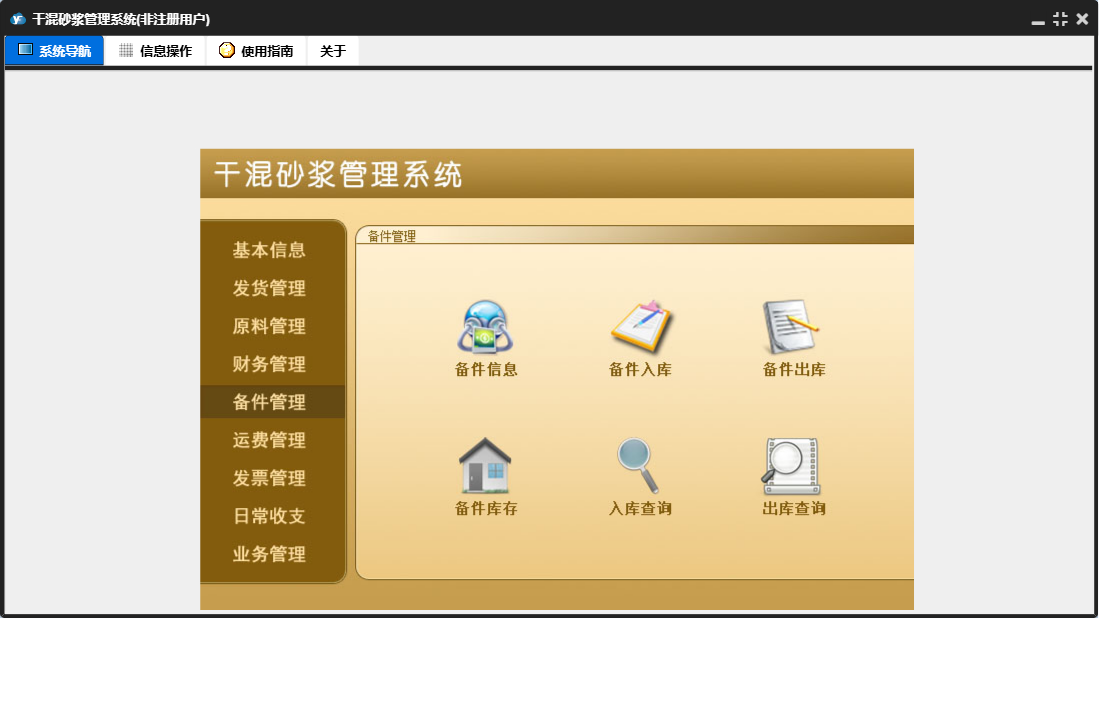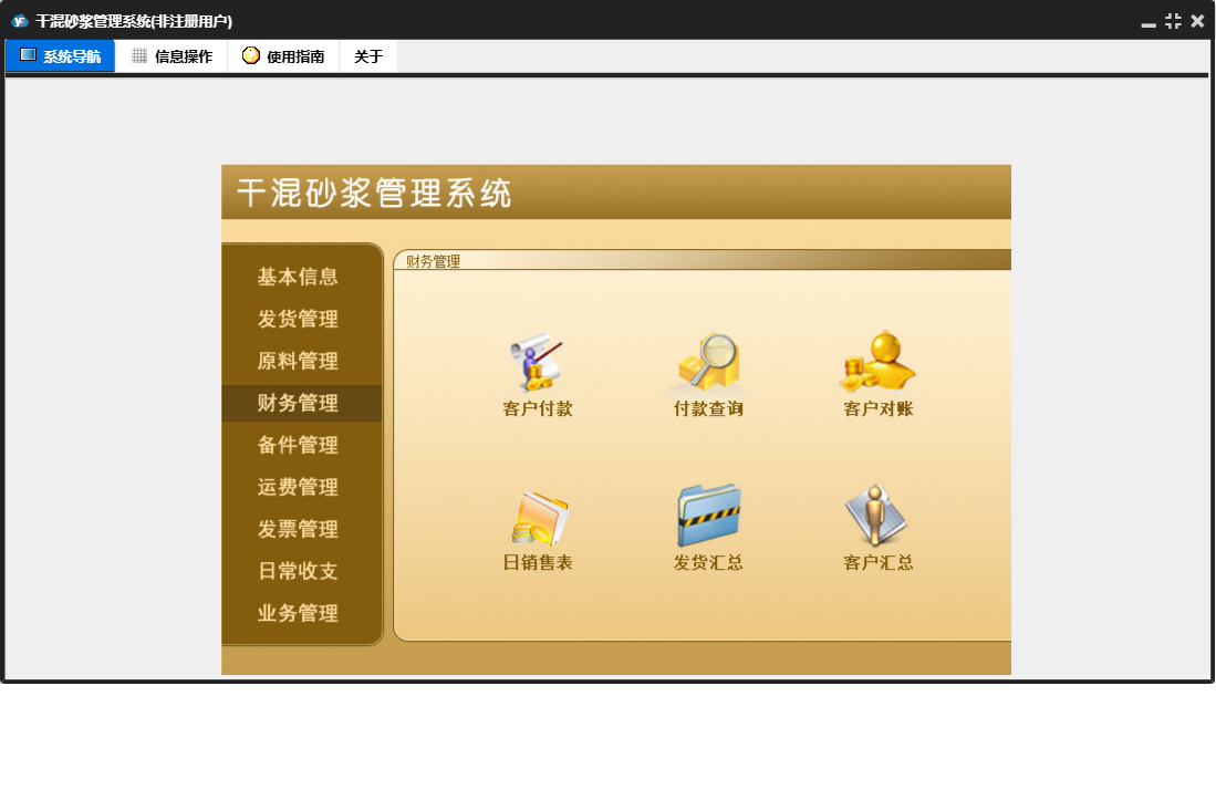 干混砂浆管理系统包含以下功能:运费结算、发票管理、日常支出、备件信息、原料入库、产品信息、发货登记、备件出库、财务管理、开具发票、中控室发货、原料使用、权限设置、业务结算、原料管理、运费管理、原料信息、零售登记、日常收支、关于、基本信息、罐子信息、日常收入、备件管理、客户信息、发货管理、车辆信息、业务管理、客户付款、司机信息、员工信息、日志、备件入库、供商信息等
