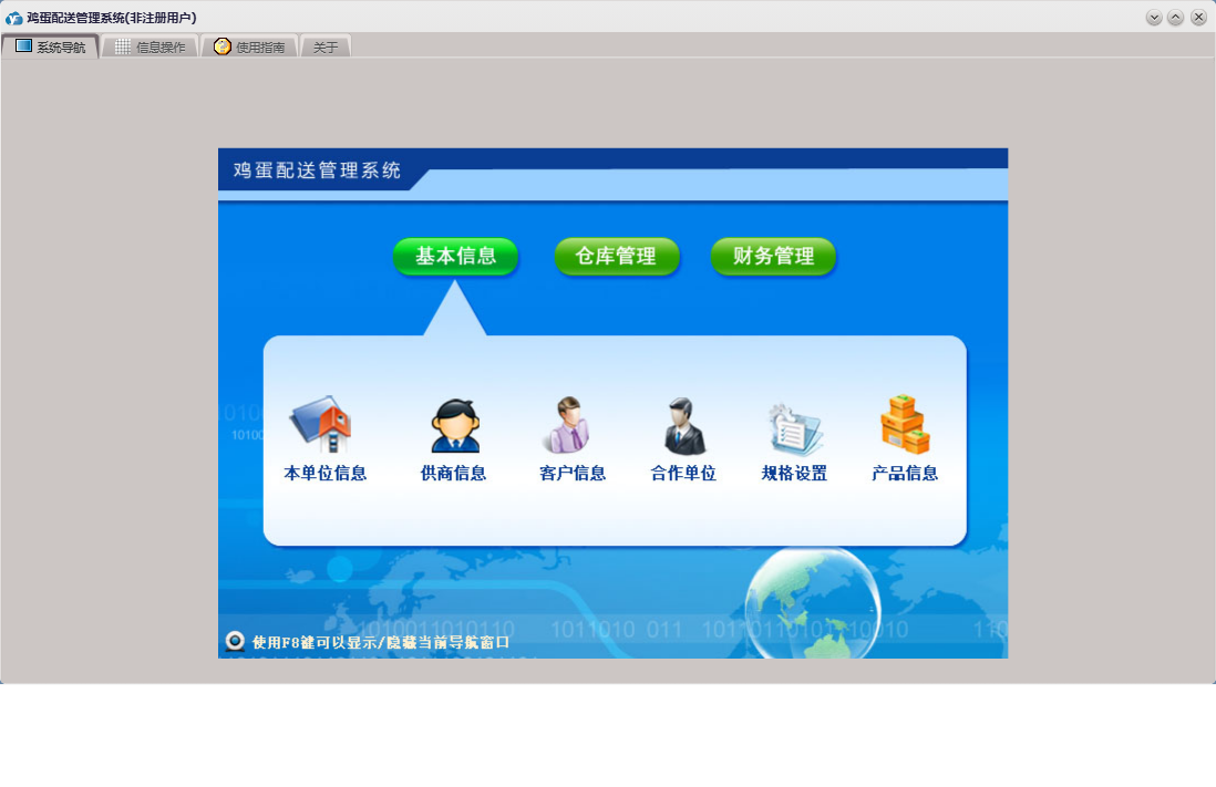 鸡蛋配送管理系统包含以下功能:付供商欠款登记、单位信息、财务管理、供商信息、供应退货、客户退货、日志、仓库管理、关于、销售登记、基本信息、权限设置、产品信息、客户信息、收客户欠款登记、进货登记等