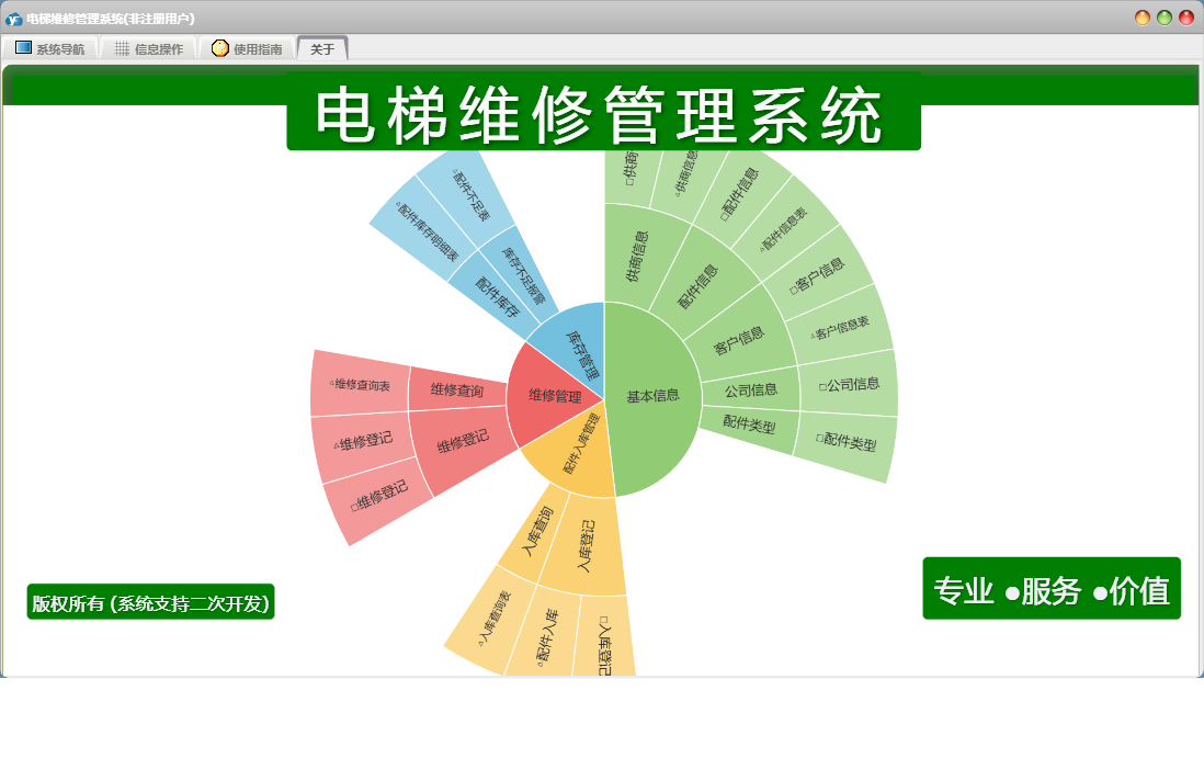 电梯维修管理系统包含以下功能:面板、入库登记、维修登记、公司信息、日志、关于、权限设置、配件类型、客户信息、配件信息、供商信息等