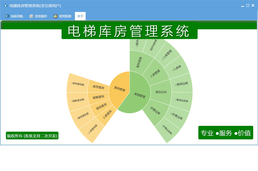 电梯库房管理系统包含以下功能:库房管理、入库管理、维保出库、日志、外售出库、关于、权限设置、配件信息等