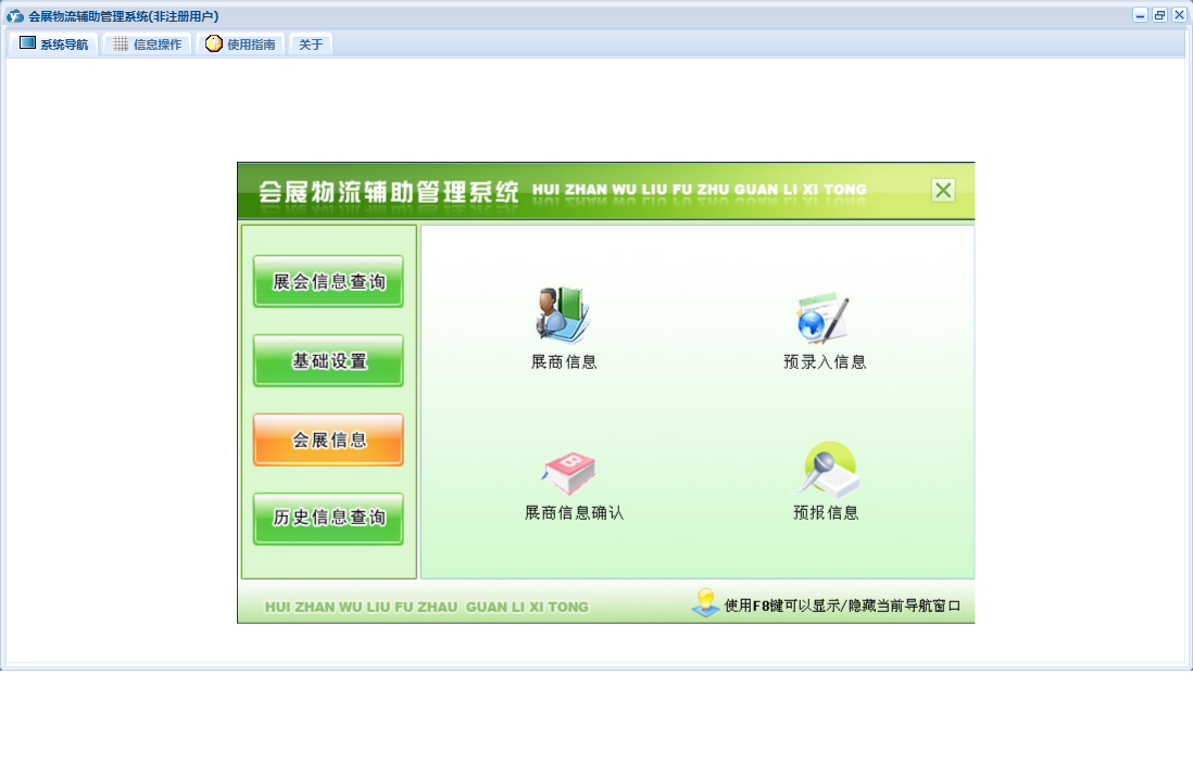 会展物流辅助管理系统包含以下功能:基础设置、会展信息、历史信息查询、展商信息确认、日志、展会信息查询、关于、权限设置、当前展会选择、展会选择等