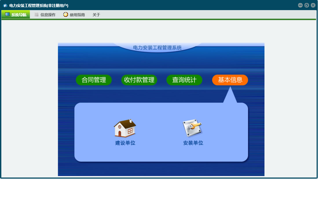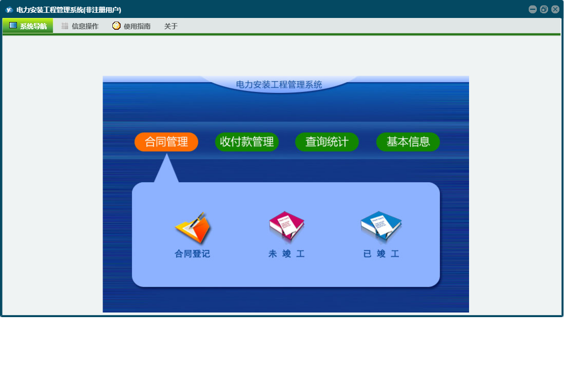 电力安装工程管理系统包含以下功能:收付款管理、查询统计、成本录入、收款情况、关于、基本信息、合同登记、合同管理等