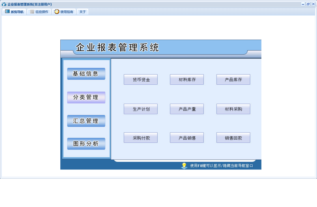 企业报表管理系统包含以下功能:产品产量、采购付款、货币资金、产品信息、分类管理、生产经营日、销售回款、材料信息、汇总管理、权限设置、部门信息、材料库存、产品库存、关于、客户信息、产品销售、图形分析、基础信息、材料采购、生产计划、日志、供商信息等