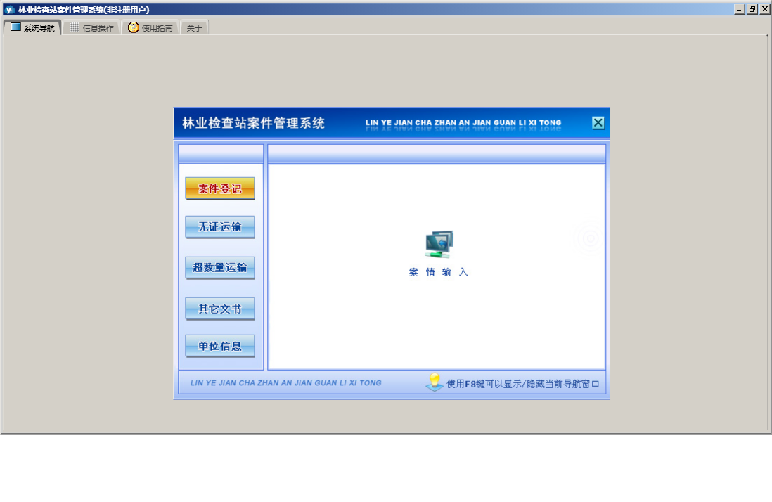 林业检查站案件管理系统包含以下功能:单位信息、其它文书、日志、案件登记、关于、权限设置、无证运输、超数量运输、检尺码单等