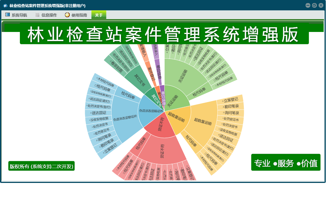 林业检查站案件管理系统增强版包含以下功能:单位信息、其它文书、货证不符、日志、案件登记、关于、权限设置、无证运输、超数量运输、伪造涂改运输证件、检尺码单等