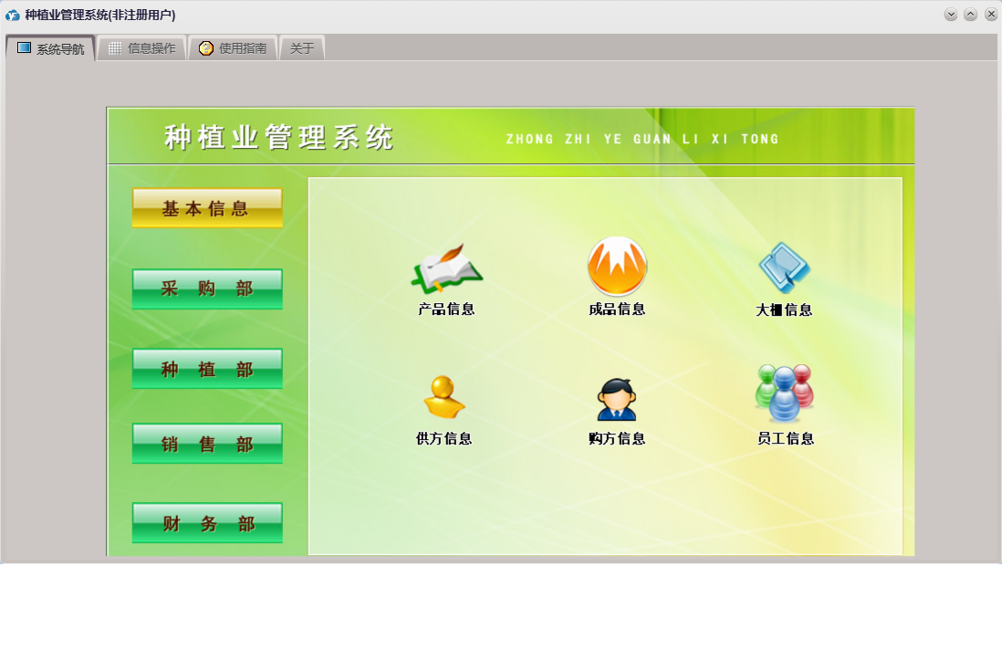 种植业管理系统包含以下功能:产品信息、产品损耗、成品信息、种植部、费用收入、成品销售、权限设置、采摘入库、费用支出、采购部、绩效考核、销售部、购方信息、考勤登记、关于、基本信息、成品损耗、大棚信息、财务部、供方信息、员工信息、产品入库、产品出库、日志等