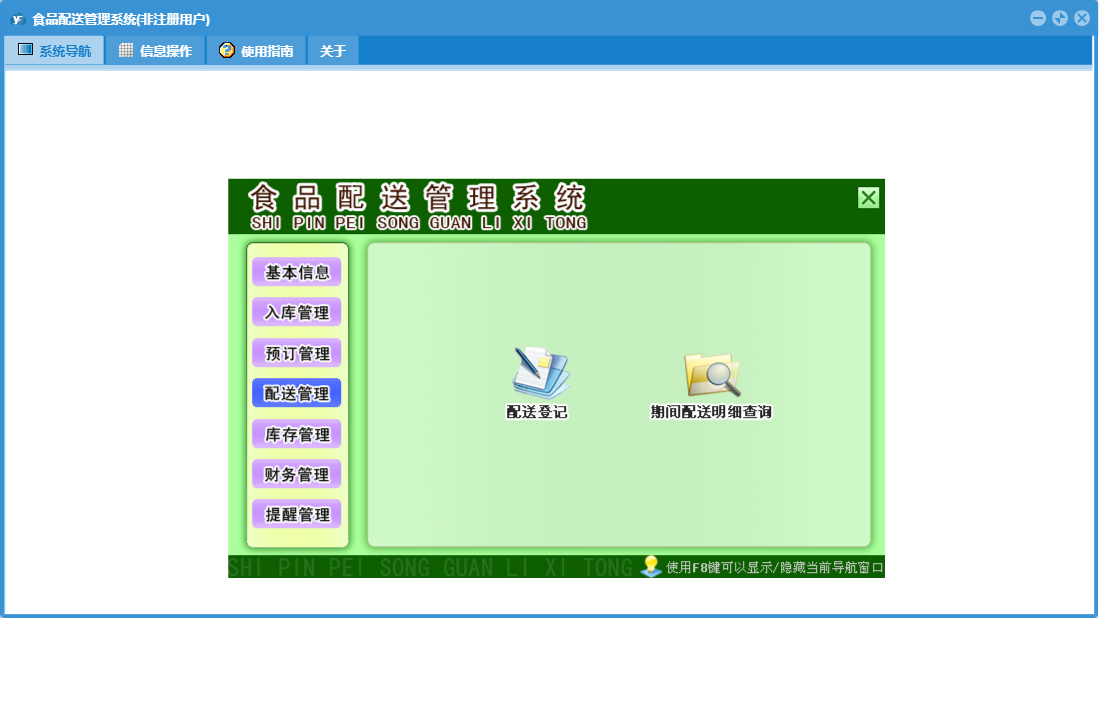 食品配送管理系统包含以下功能:入库管理、预订登记、提醒管理、配送员信息、配送登记、日志、库存管理、配送管理、订户资料、区域信息、食品信息、关于、后付款订户、基本信息、权限设置、预订管理、财务管理、食品入库等