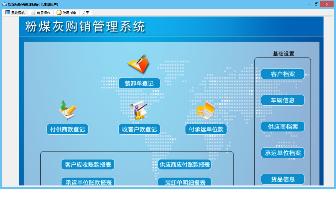 粉煤灰购销管理系统包含以下功能:客户档案、货品信息、装卸单登记、面板、收客户款登记、日志、付供商款登记、关于、权限设置、供应商档案、承运单位档案、付承运单位款、车辆信息等