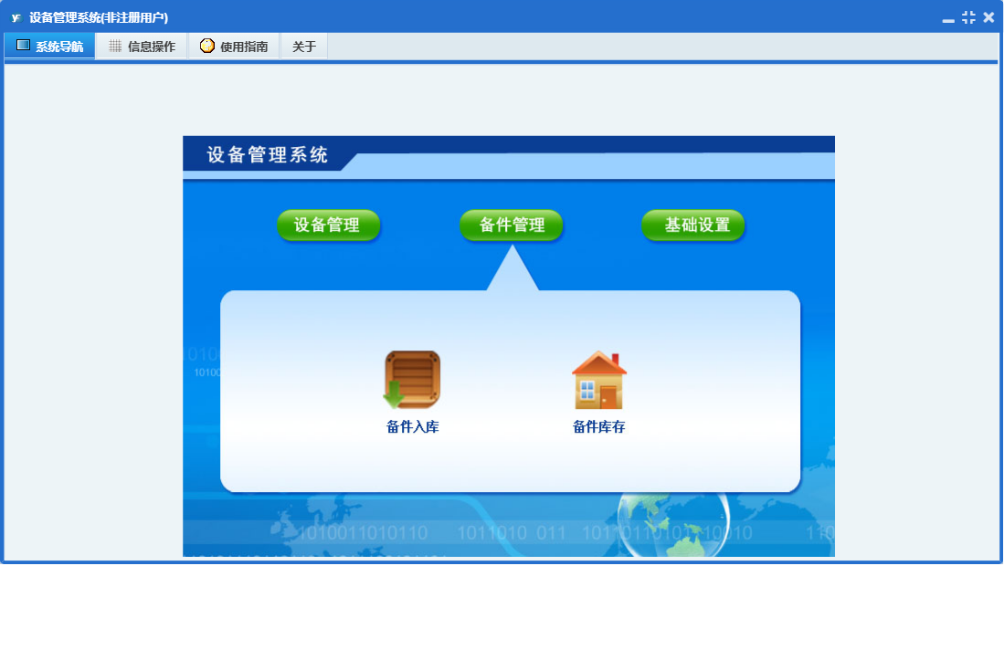 设备管理系统包含以下功能:关于、基础、设备、备件等