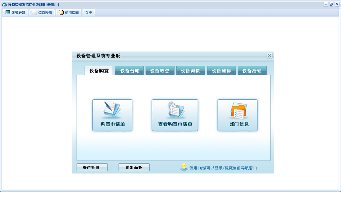 设备管理系统专业版包含以下功能:调拨单台帐、设备维修、调拨结束通知单、调拨申报、购置申请单、设备报废申报、设备报废审批、日志、设备更改、设备转资申请、关于、设备调拨、转资备忘录、权限设置、设备清理、设备转资、设备台帐、设备购置等