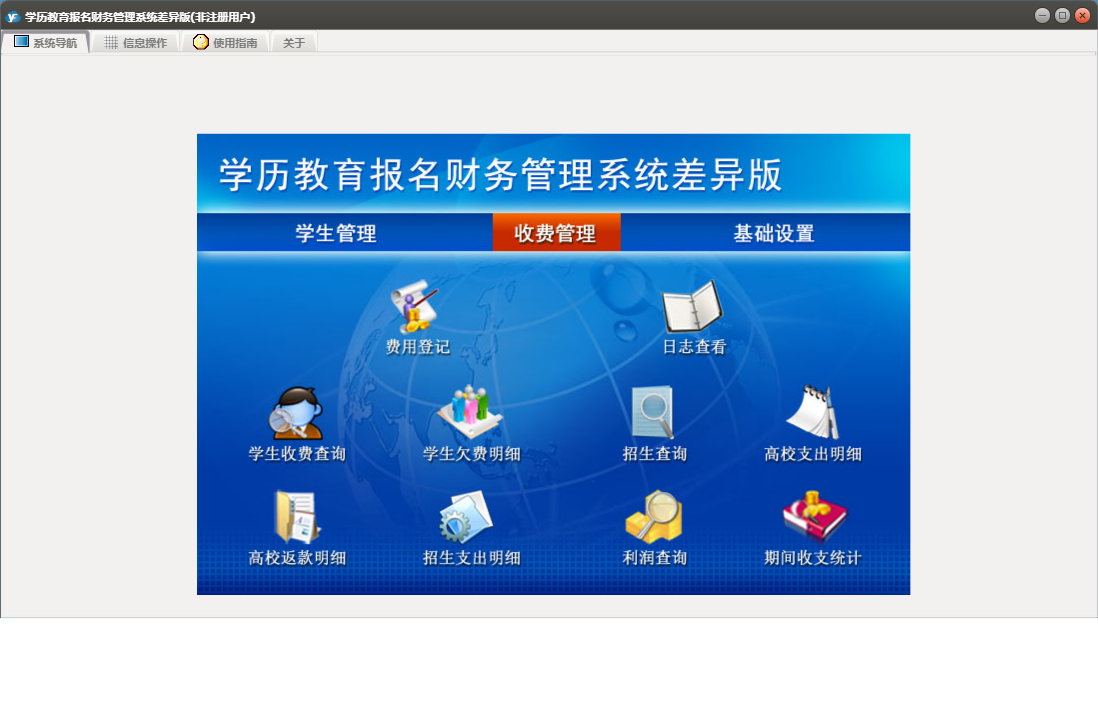 学历教育报名财务管理系统差异版包含以下功能:基础信息、学生管理、学生信息、日志、学生查询、关于、权限设置、费用登记、收费管理等