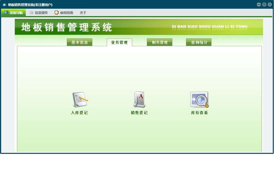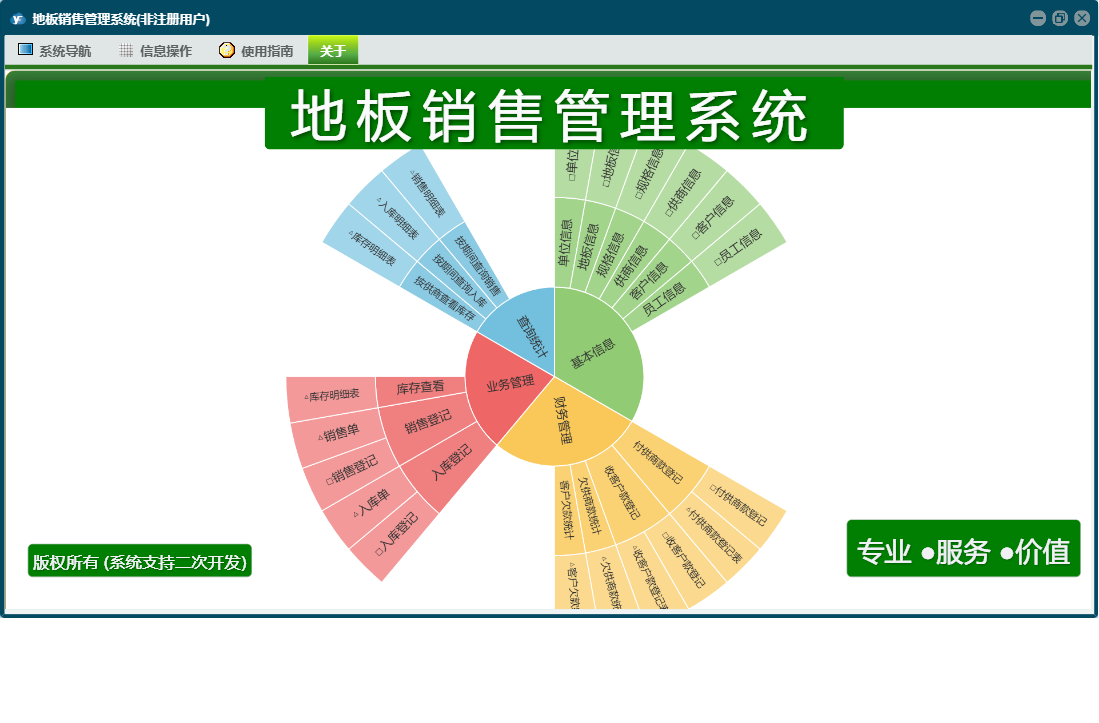 地板销售管理系统包含以下功能:规格信息、单位信息、查询统计、日志、关于、权限设置、基本信息、财务管理、业务管理等