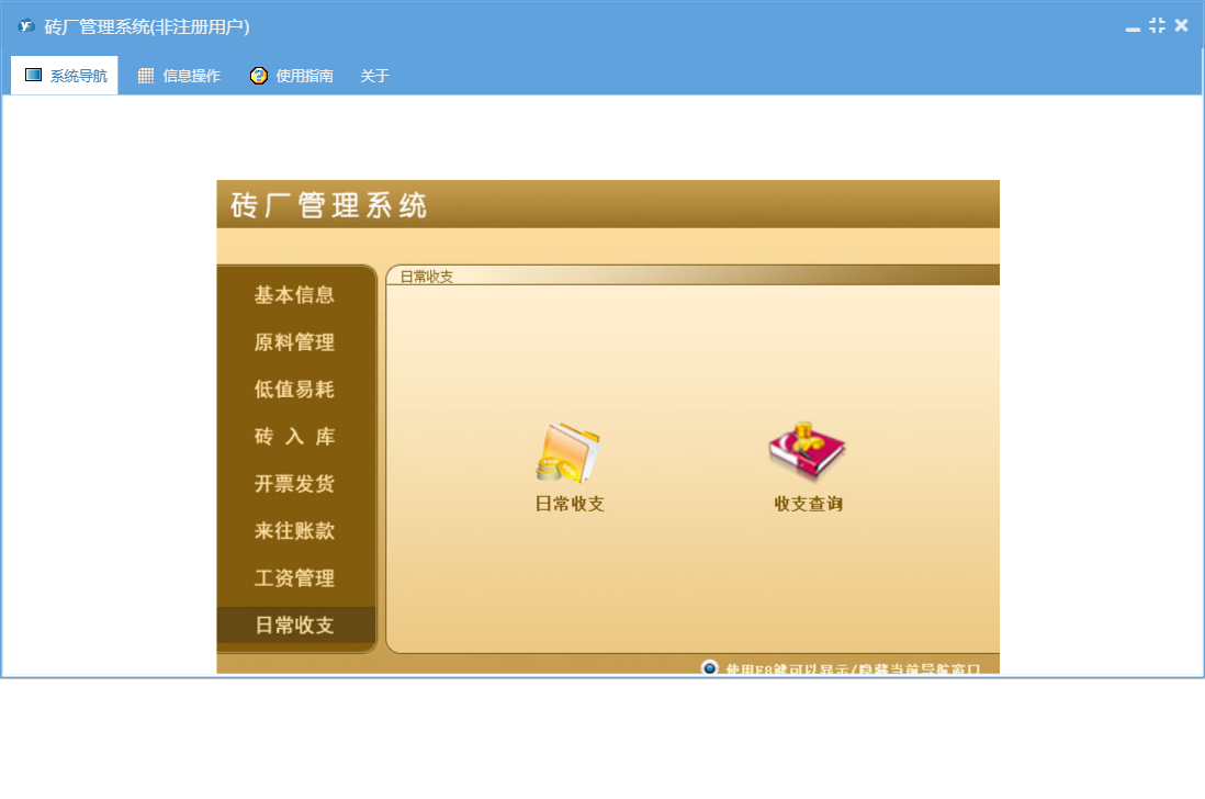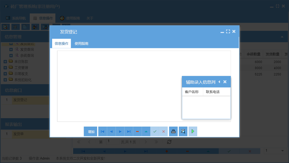 砖厂管理系统包含以下功能:原料入库、客户收款、产品信息、发货登记、成品入库、低值易耗品入库、低值易耗品领用、原料使用、开票发货、权限设置、供商付款、原料管理、低值易耗、工资管理、原料信息、低值易耗信息、日常收支、岗位设置、关于、基本信息、客户信息、卖砖开票、计件工资、砖入库、司机信息、员工信息、日志、来往账款、司机运费、供商信息等