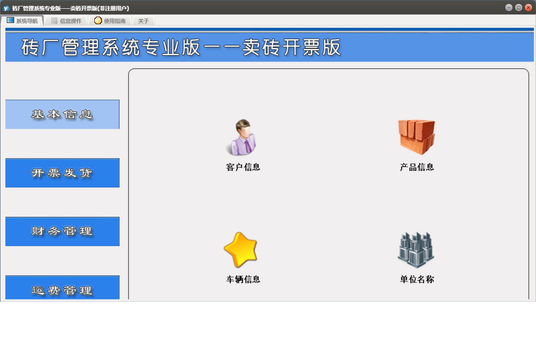 砖厂管理系统专业版——卖砖开票版包含以下功能:现金开票、工地发货、工地付款、砖票发货、日志、关于、开票发货、基本信息、权限设置、工地开票、客户信息、产品信息、砖票开票、财务管理、车辆信息、运费管理等