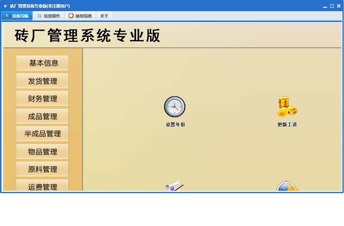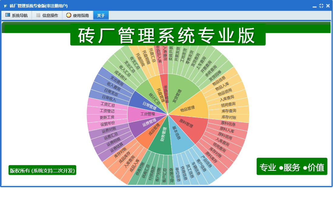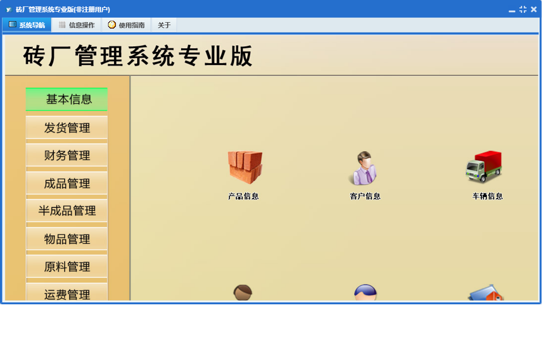 砖厂管理系统专业版包含以下功能:运费结算、成品管理、日常支出、原料入库、产品信息、收客户款、统计汇总、工资登记、财务管理、托盘回收、成品入库、零售发货、半成品入库、开票发货、权限设置、付供商款、原料管理、工资管理、运费管理、原料信息、关于、托盘管理、基本信息、日常收入、物品管理、客户信息、发货管理、物品信息、物品领用、卖砖开票、车辆信息、日常管理、工地发货、物品入库、员工信息、日志、半成品管理、供商信息等