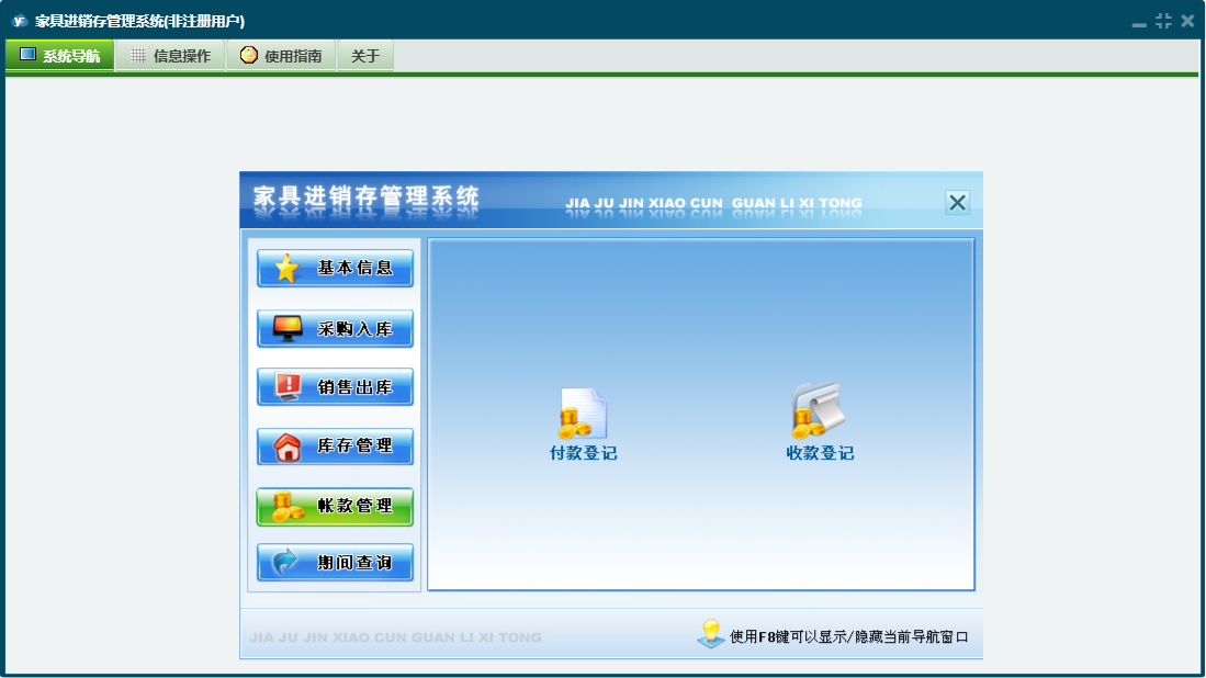 家具进销存管理系统包含以下功能:供应商资料、商品材质、员工资料、期间查询、商品品牌、商品类别、商品基本信息、付款登记、仓库资料、权限设置、出库退货、销售出库、收款登记、入库退货、公司资料、库存管理、关于、基本信息、明细账簿、客户资料、入库管理、日志、采购管理、采购入库、超储库存警戒、商品颜色等