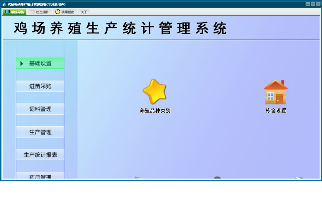 鸡场养殖生产统计管理系统包含以下功能:基础设置、药品管理、出库登记、肉鸡生产记录表、用料记录、人事管理、药品类别设置、入库登记、权限设置、饲料信息、养殖品种类别、人员档案、供应商信息、员工工资、蛋鸡生产记录表、关于、疫苗管理、进苗采购、客户信息、用药记录、员工借款、生产统计、饲料管理、疫苗设置、药品设置、日志、栋舍设置、防疫记录、生产管理、饲料出库、进苗登记、用药审批、饲料入库等