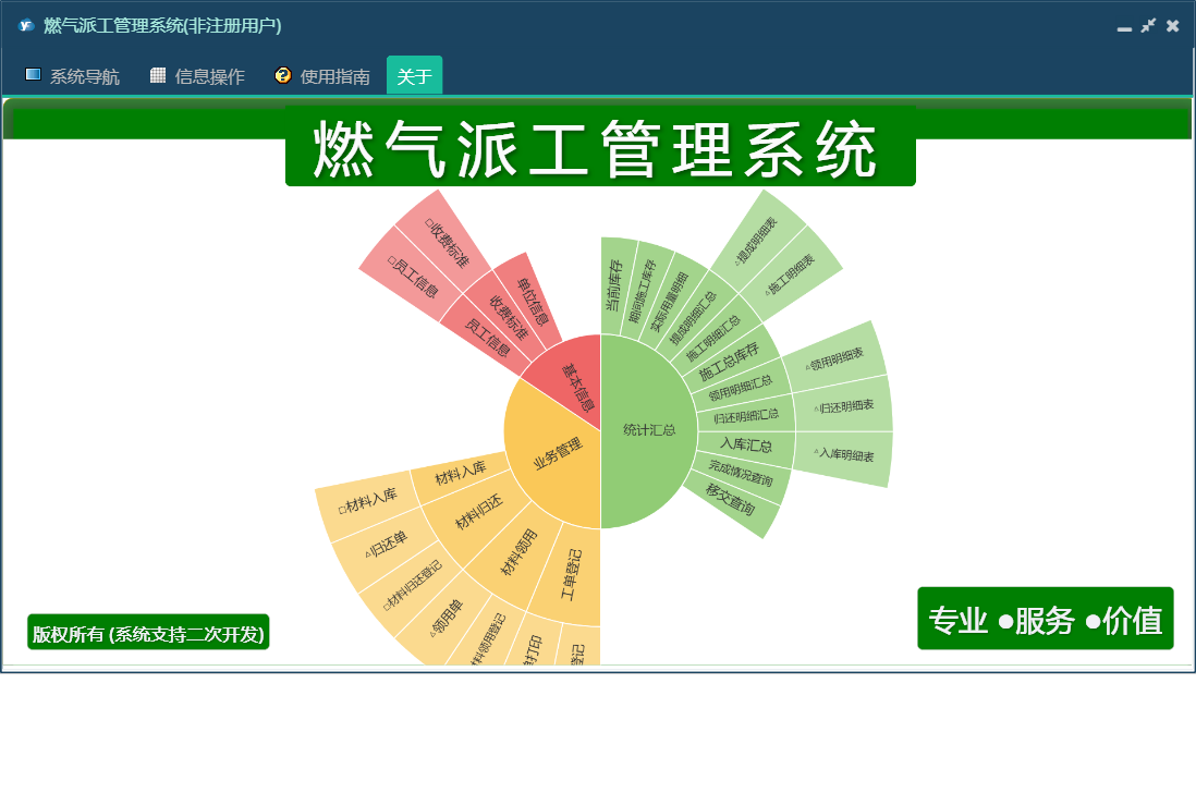 燃气派工管理系统包含以下功能:材料领用、收费标准、员工信息、日志、统计汇总、关于、基本信息、权限设置、材料归还、工单登记、材料入库、业务管理等