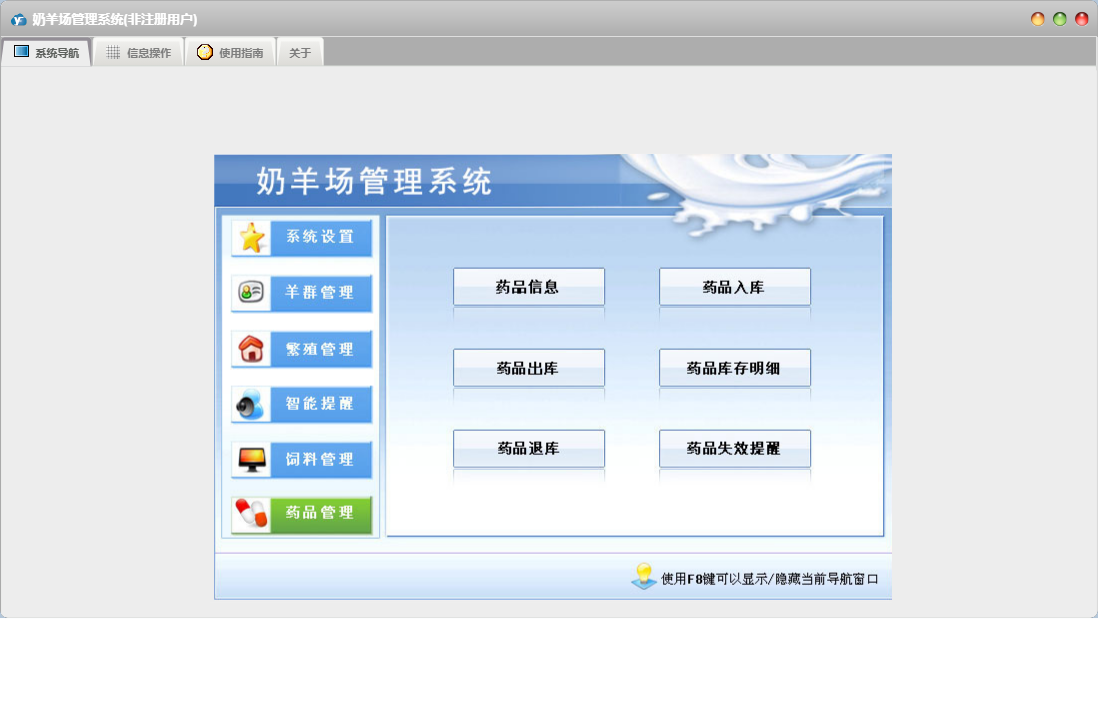 奶羊场管理系统包含以下功能:药品管理、饲料名称设置、免疫保健设置、繁殖管理、妊娠诊断(报孕)、场内移动、药品入库、羊群管理、发情、权限设置、产犊登记、羊只资料、药品信息、羊舍设置、智能提醒、关于、药品退库、系统设置、药品出库、饲料管理、离场登记、饲料退库、产乳登记、妊娠检查(定胎)、日志、整场移动、流产登记、饲料出库、奶厅设置、饲料入库等