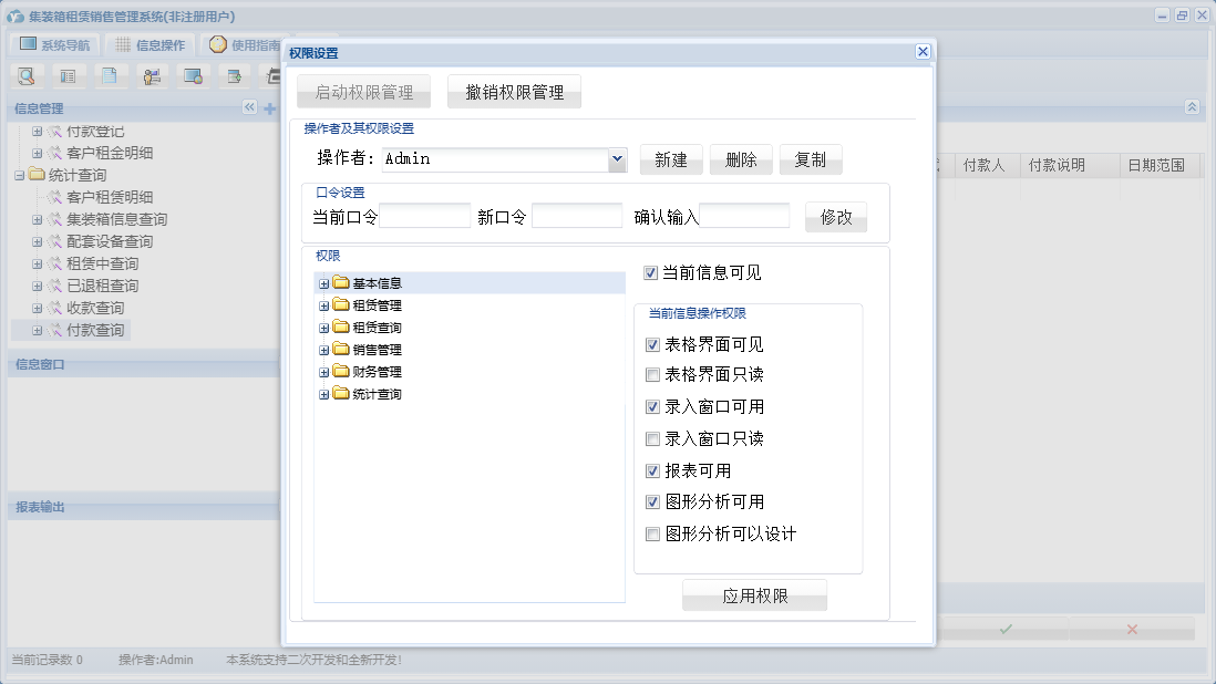 集装箱租赁销售管理系统包含以下功能:退箱登记、销售管理、移箱登记、租赁送货单、租赁管理、合同登记、财务管理、合同查询、付款登记、权限设置、统计查询、收款登记、设备信息、关于、销售登记、基本信息、客户信息、租赁查询、日志等