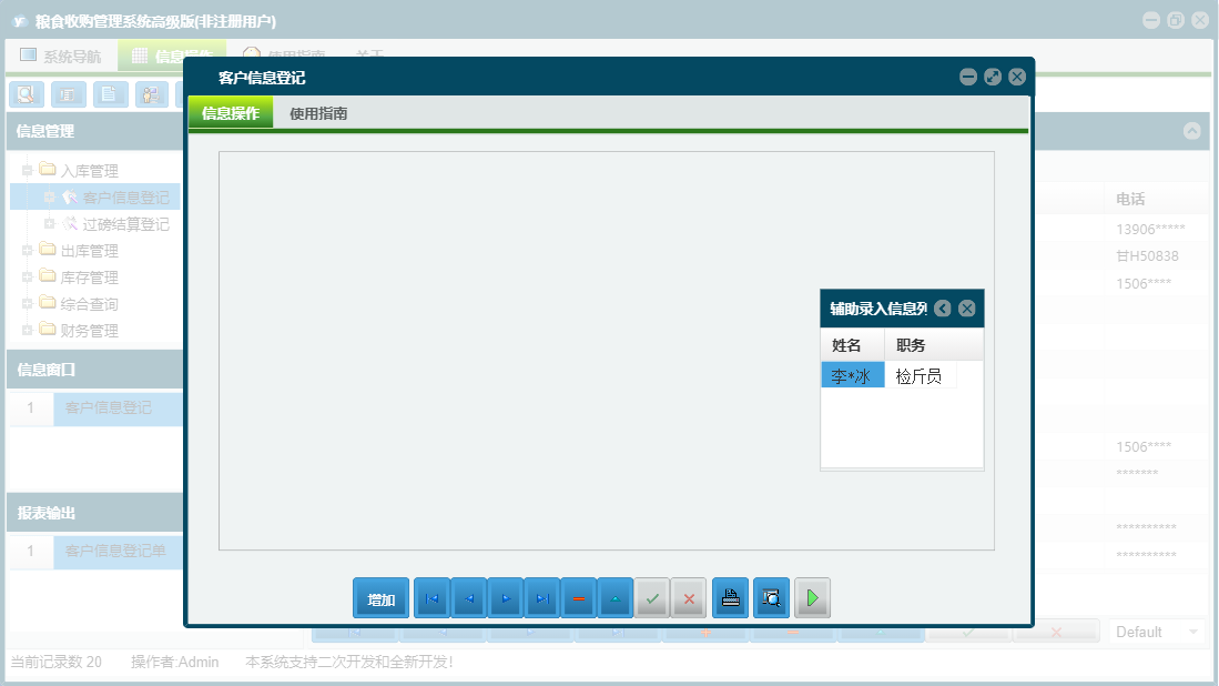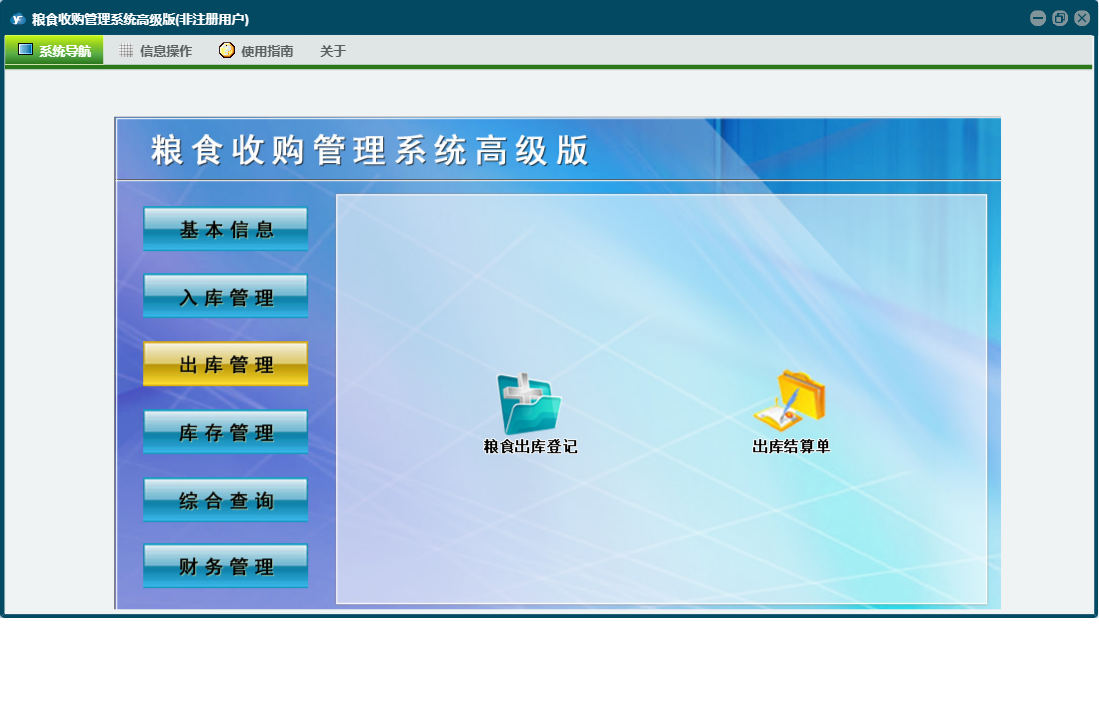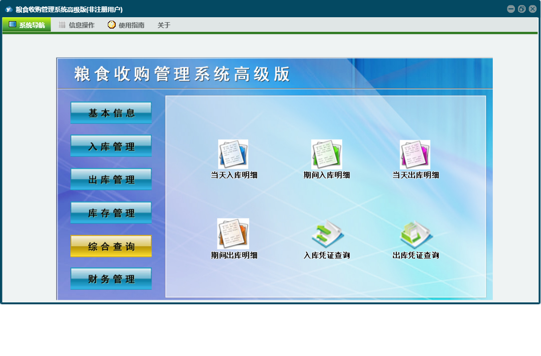 粮食收购管理系统高级版包含以下功能:综合查询、粮食出库登记、财务管理、公司信息、仓口信息、权限设置、出库结算单、出库管理、其它收入登记、库存管理、其它支出登记、关于、客户信息登记、基本信息、客户信息、入库管理、日志、过磅结算登记、人员信息等