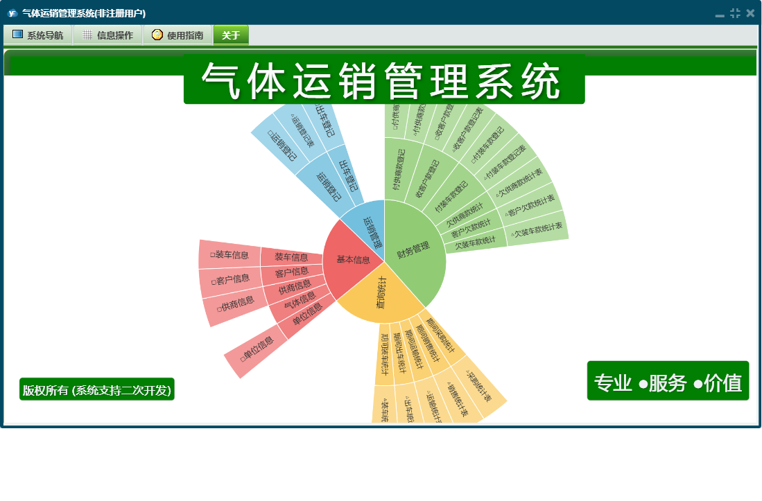 气体运销管理系统包含以下功能:付装车款登记、查询统计、供商信息、收客户款登记、运销管理、日志、付供商款登记、关于、基本信息、权限设置、客户信息、财务管理、运销登记、装车信息等