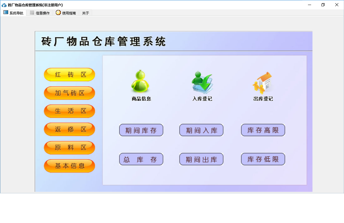 砖厂物品仓库管理系统包含以下功能:生活区、原料信息、入库登记、商品信息、原料入库、供商信息、出库登记、红砖区、返修区、日志、关于、基本信息、原料区、权限设置、加气砖区、返修入库、返修登记、原料出库等