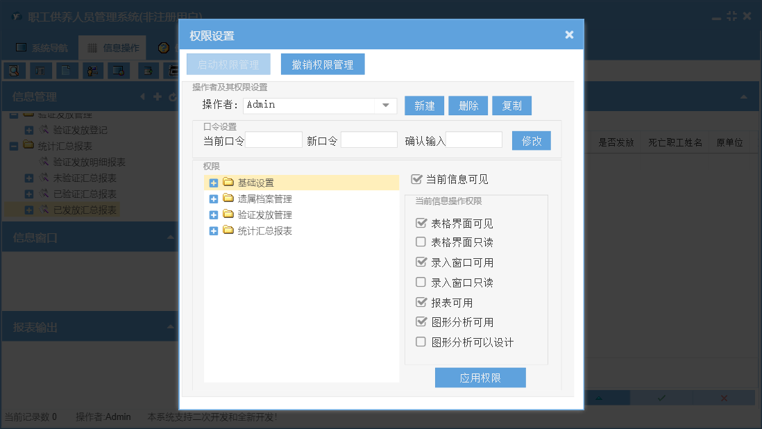 职工供养人员管理系统包含以下功能:基础设置、验证发放登记、遗属档案、日志、关于、权限设置、验证发放管理、统计汇总、遗属档案管理等