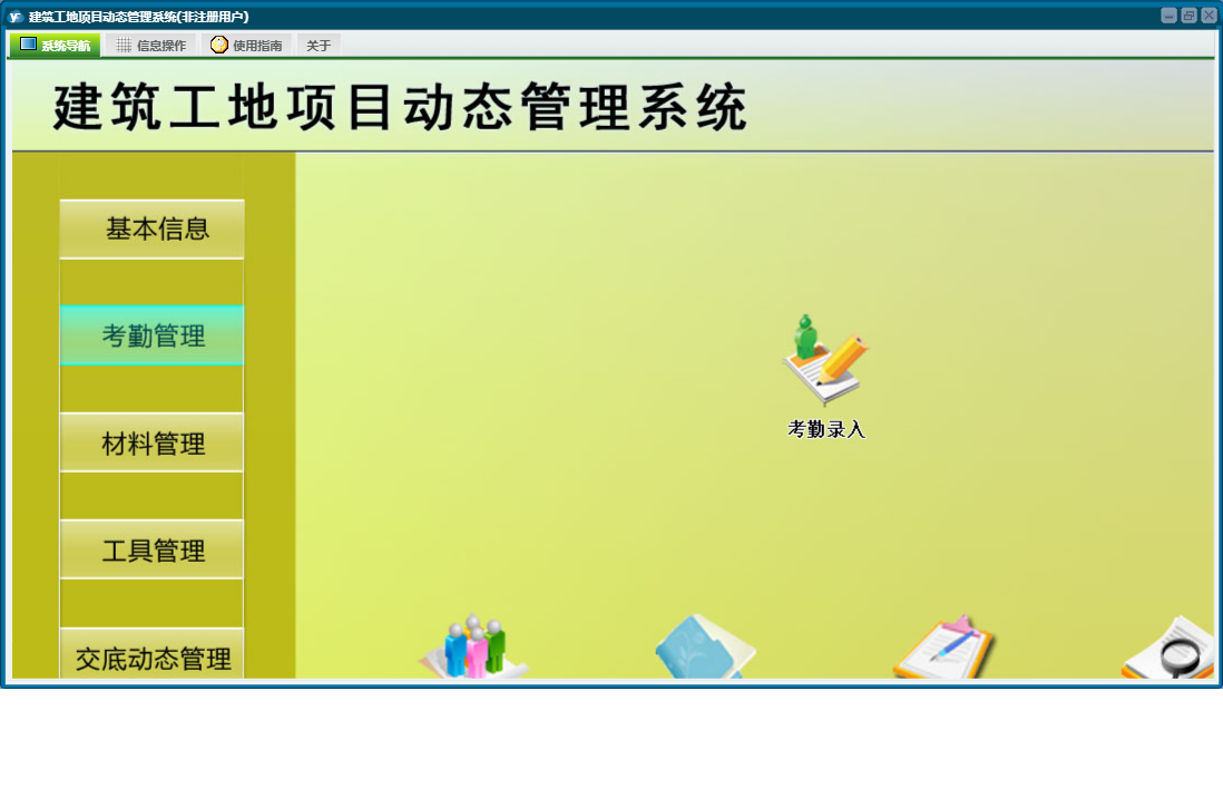 建筑工地项目动态管理系统包含以下功能:项目开支报销、现场签证管理、材料动态、考勤管理、项目负责人信息、财务管理、工具设备报废、工具设备调拨、交底动态管理、材料信息、点工班、权限设置、分包班、辅助登记表、工具设备动态、工具管理、现场签证单、员工自、材料调拨、在建项目信息、考勤录入、关于、企业文化信息、材料管理、突击队用工登记、基本信息、项目收支平衡表、工人工资结算、工人支款明细、日志、内部公告管理、突击队、工具设备信息等