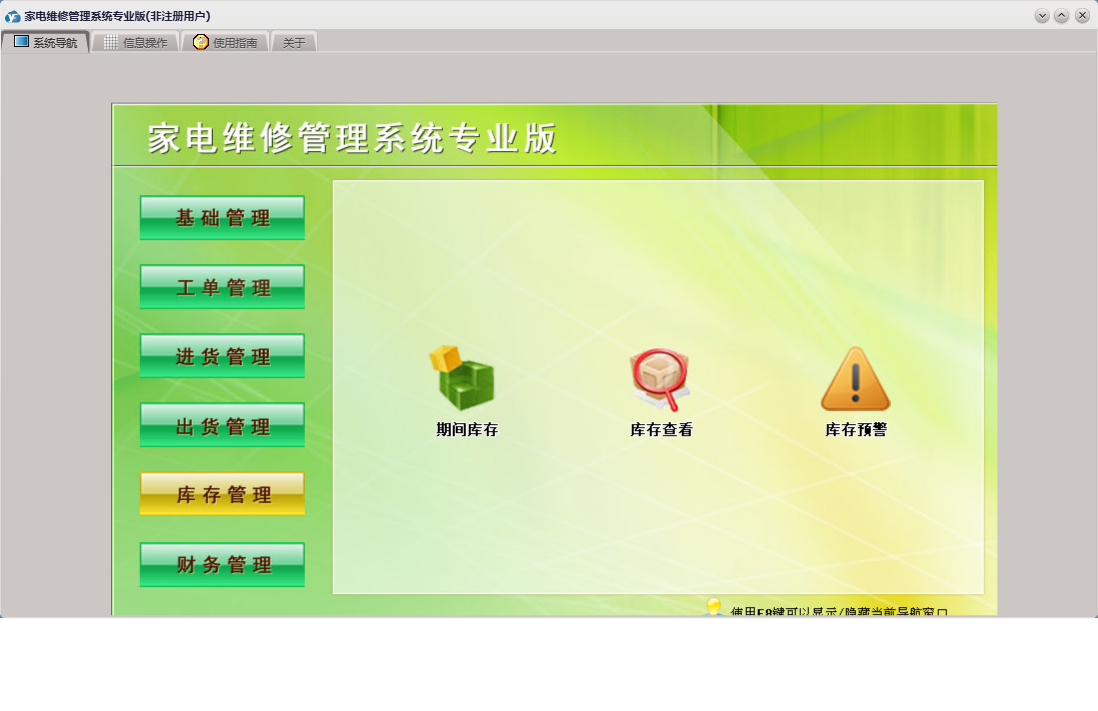 家电维修管理系统专业版包含以下功能:日常开支、用户信息录入、其它开支、派工单录入、结算费用、财务管理、回访录入、仓库设置、补贴设置、服务措施、采购进货、商品信息、旧件入库、权限设置、员工工资、出货登记、库存管理、关于、要求服务信息录入、返馈情况录入、基础管理、其它收入、出货管理、进货管理、业务单位收入、日志、员工每日考核、工单管理、供商信息、人员信息等