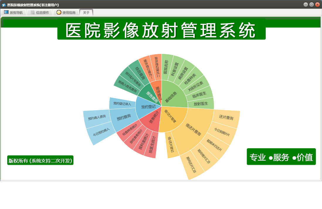 医院影像放射管理系统包含以下功能:预约登记录入、按病人姓名查询、综合查询、借、预约病人查询、劳务统计、权限设置、预约登记、报告登记模式一、报告登记模式二、报告查询、关于、放射医生、科室设置、医院名称、检查种类、基础信息、X线所见表、报告登记、按X线片号查询、日志、临床医生、病房设置等