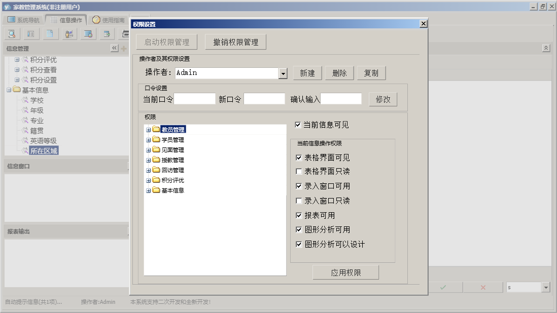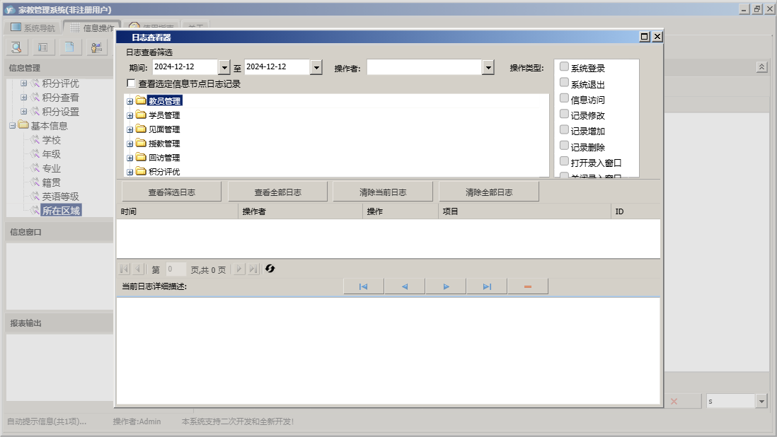 家教管理系统包含以下功能:教员管理、家教管理、权限设置、历史回访记录、积分设置、试教情况、教员档案查看、关于、基本信息、签定协议、回访提醒、积分评优、教员档案登记、未作安排的学员信息、见面试教、授教情况、学员档案登记、日志、授教情况查询、回访管理等