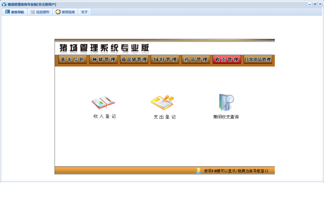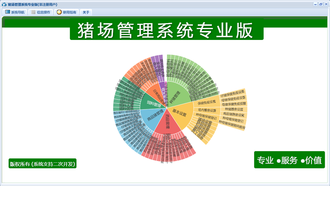 猪场管理系统专业版包含以下功能:商品猪圈舍设置、药品管理、收入登记、基本设置、猪场设置、公猪配种登记、种猪圏舍设置、种公猪资料、收支管理、诊疗登记、商品猪死亡登记、用品信息、药品入库、母猪保健免疫设置、栋别设置、采购登记、权限设置、栏别设置、种母猪保健登记、饲料信息、日常用品管理、领用登记、药品信息、支出登记、种猪转栏登记、报废登记、种猪管理、商品猪管理、关于、药品退库、种猪死亡登记、客户信息、药品出库、饲料管理、种母猪资料、饲料退库、商品猪存栏登记、商品猪转栏登记、商品猪销售登记、员工信息、消毒登记、仔猪保健免疫设置、日志、母猪繁殖登记、种猪销售登记、饲料出库、品种设置、饲料入库、仔猪断奶登记等