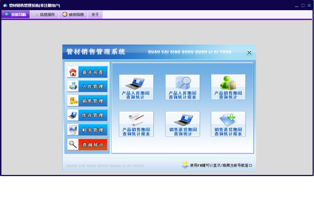 管材销售管理系统包含以下功能:供应商信息、付供商欠款登记、入库管理、销售管理、查询统计、基本设置、入库登记、员工信息、销售退货、日志、库存管理、关于、产品信息、销售登记、权限设置、客户信息、财务管理、付销售欠款登记等