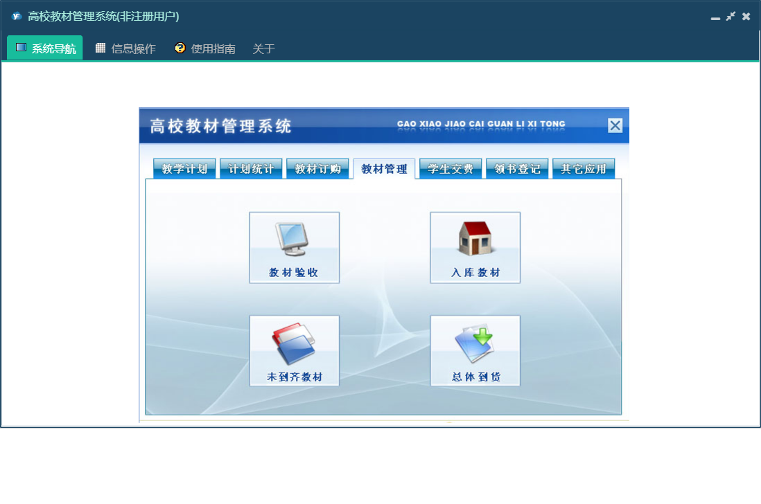 高校教材管理系统包含以下功能:订单汇总、订单查询、生成订单、教材室审核、撰写通知、领书登记、教学计划、权限设置、教材验收、教材管理、未到齐教材、总体到货、教材订购、关于、其它应用、计划统计、学生交费、确定供应商、交费明细查询、班级交费查询、日志、入库教材、查看通知、系部审核等