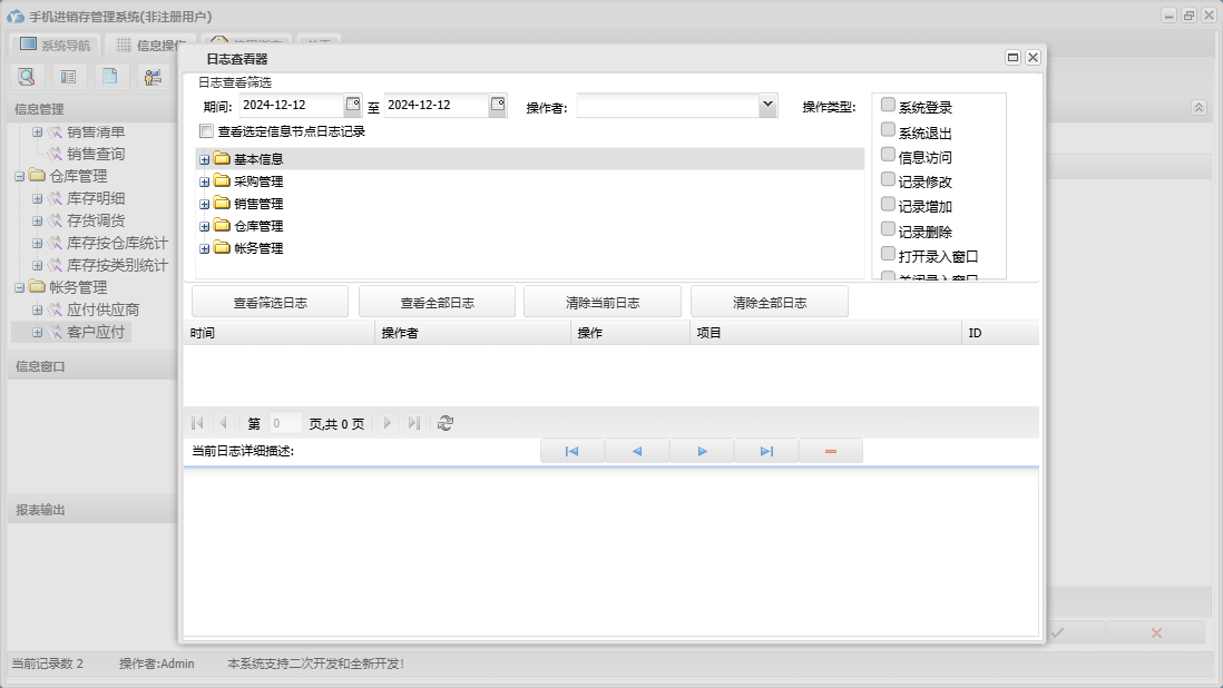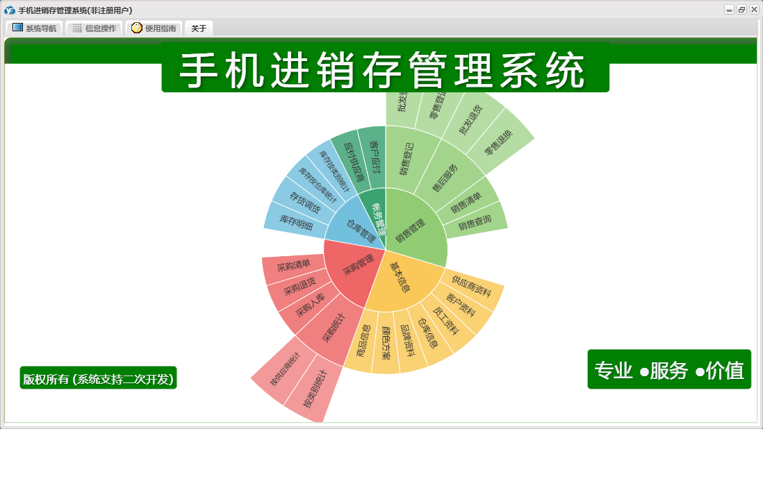 手机进销存管理系统包含以下功能:零售退换、供应商资料、销售管理、员工资料、批发退货、商品信息、存货调货、权限设置、仓库信息、批发登记、零售登记、采购退货、仓库管理、关于、基本信息、客户资料、账务管理、品牌资料、日志、采购管理、采购入库、颜色方案等