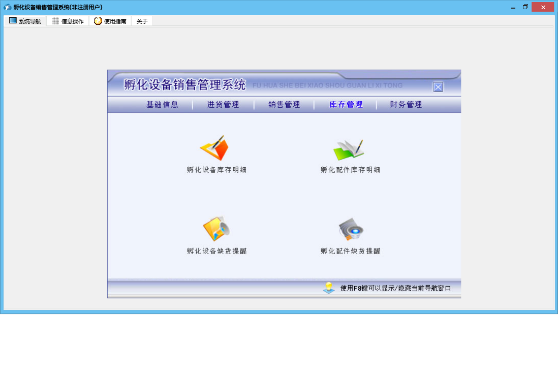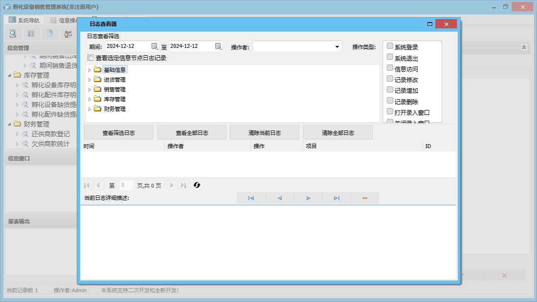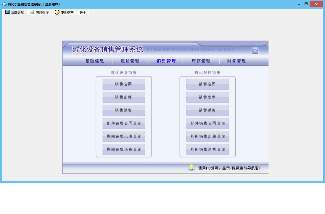 孵化设备销售管理系统包含以下功能:销售管理、孵化配件入库登记、孵化配件退货登记、财务管理、孵化设备信息、销售退货、孵化设备入库登记、权限设置、销售出库、客户付款登记、供应商信息、单位信息、库存管理、关于、销售合同、客户信息、孵化设备退货登记、孵化配件信息、基础信息、进货管理、日志、还供商款登记等