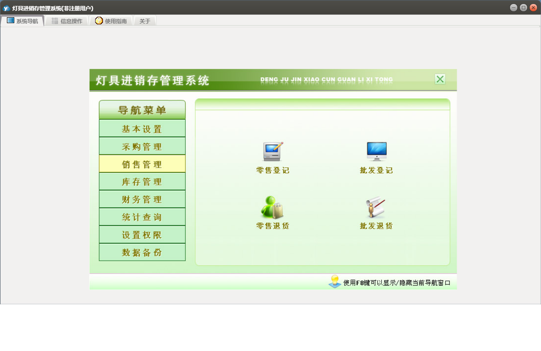 灯具进销存管理系统包含以下功能:销售管理、基本设置、产品信息、财务管理、付供商欠款登记、批发退货、付欠款登记、权限设置、零售退货、统计查询、仓库信息、批发登记、零售登记、采购退货、库存管理、关于、客户信息、员工信息、日志、采购管理、采购入库、客户付欠款登记、供商信息等