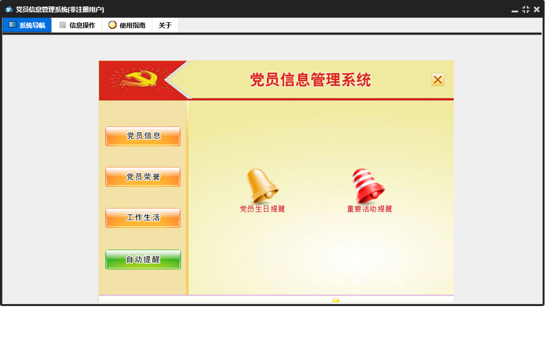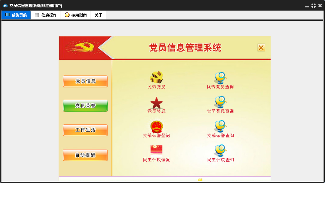 党员信息管理系统包含以下功能:发展党员信息、自动提醒、党员信息录入、重要活动、党员信息、民主评议情况、权限设置、党员奖惩、支部荣誉登记、党员流出登记、组织生活、党费登记、关于、工作安排、重要活动提醒、入党积极分子、优秀党员、日志、党员荣誉、党员生日提醒、工作生活等