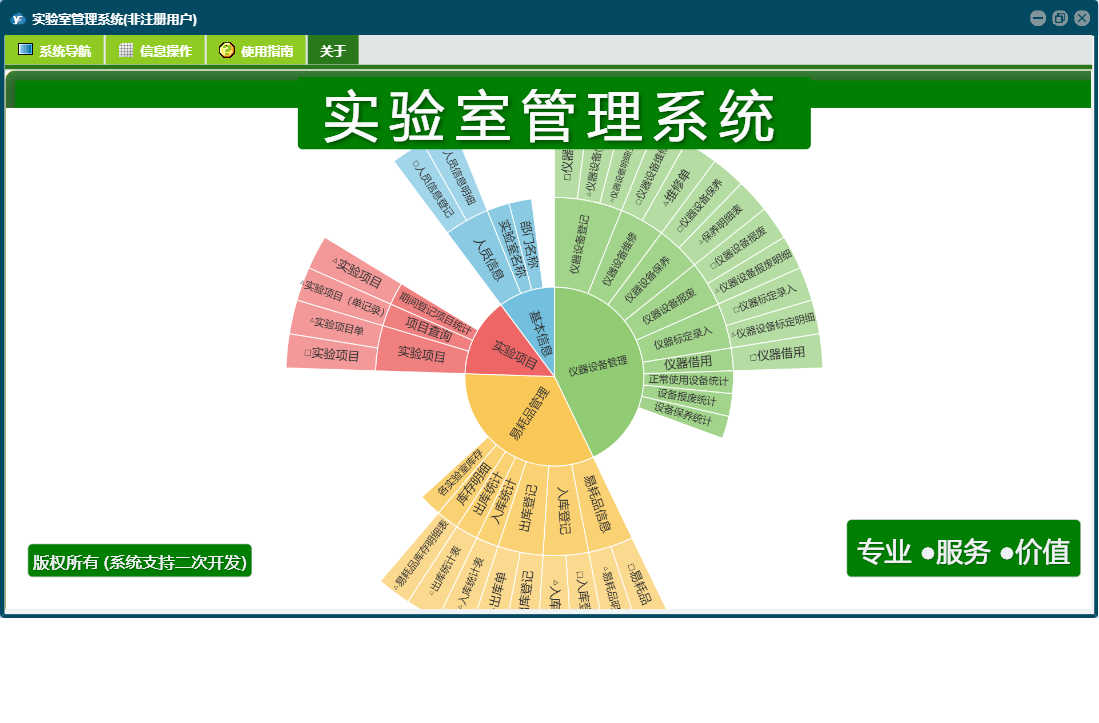 实验室管理系统包含以下功能:实验项目、仪器设备登记、入库登记、出库登记、仪器标定录入、日志、仪器设备维修、仪器借用、仪器设备管理、关于、权限设置、基本信息、易耗品管理、仪器设备报废、易耗品信息、仪器设备保养、人员信息等