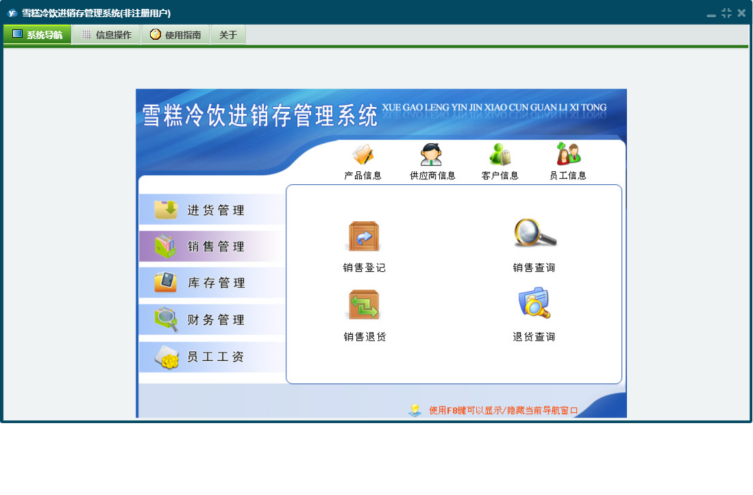 雪糕冷饮进销存管理系统包含以下功能:进货退货、1、产品信息、2、客户账登记、报损登记、销售退货、权限设置、进货登记、3、供应商信息、员工工资、5、关于、销售登记、客户信息、供商账登记、员工信息、日常费用、日志、4等