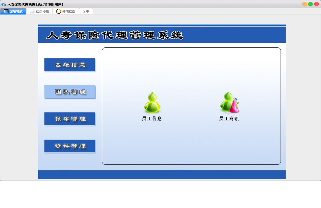 人寿保险代理管理系统包含以下功能:员工离职、保单管理、基础信息、员工信息、保单录入、日志、团队管理、孤儿单变更、关于、权限设置、资料管理等